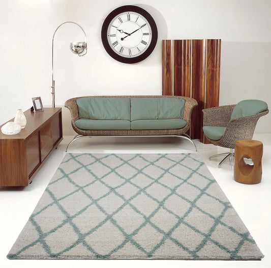 Victoria Trellis Ivory Aqua Green Shaggy Area Rug