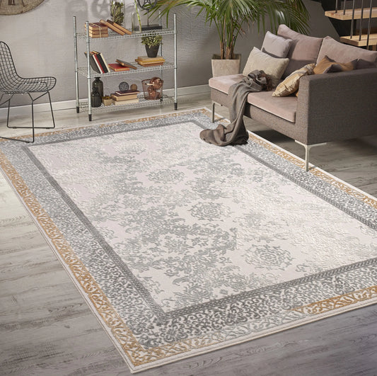 Grey Gold Abstract Bordered Luxury Modern Contemporary Area Rug