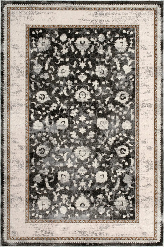 Dark Grey Ivory Traditional Bordered Living Room Bedroom Area Rug