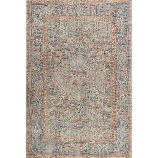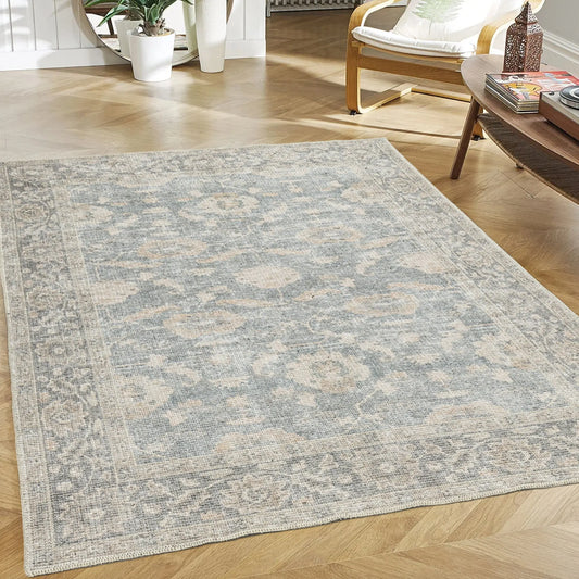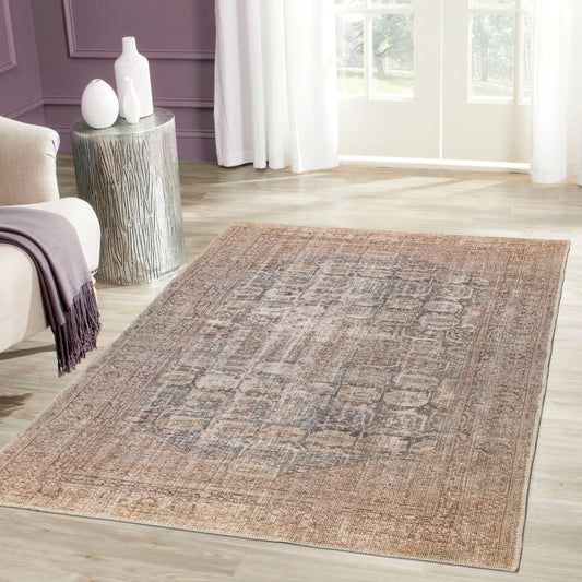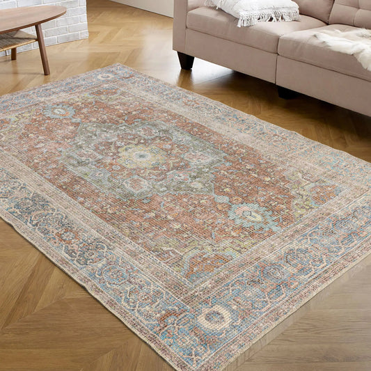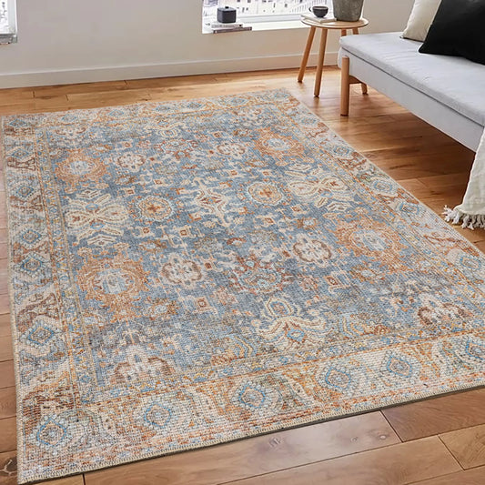 Blue Brown Machine Washable Boho Traditional Area Rug For Living Room, Bedroom